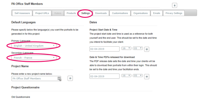 - Gehen Sie in Ihrem Projekt zur Registerkarte „Einstellungen“. Wählen Sie eine oder zwei Sprachen aus, in denen die Porträts in diesem Projekt erstellt werden sollen. Ihre Änderungen werden automatisch gespeichert.