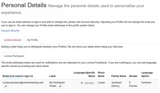 Aktualisieren Sie Ihren Namen, Ihr Geschlecht oder Ihre Sprachoption, die Benachrichtigungs-E-Mail-Adresse für Teilnehmer und Praktiker, zusätzliche Namen und Profilbezeichnungen.